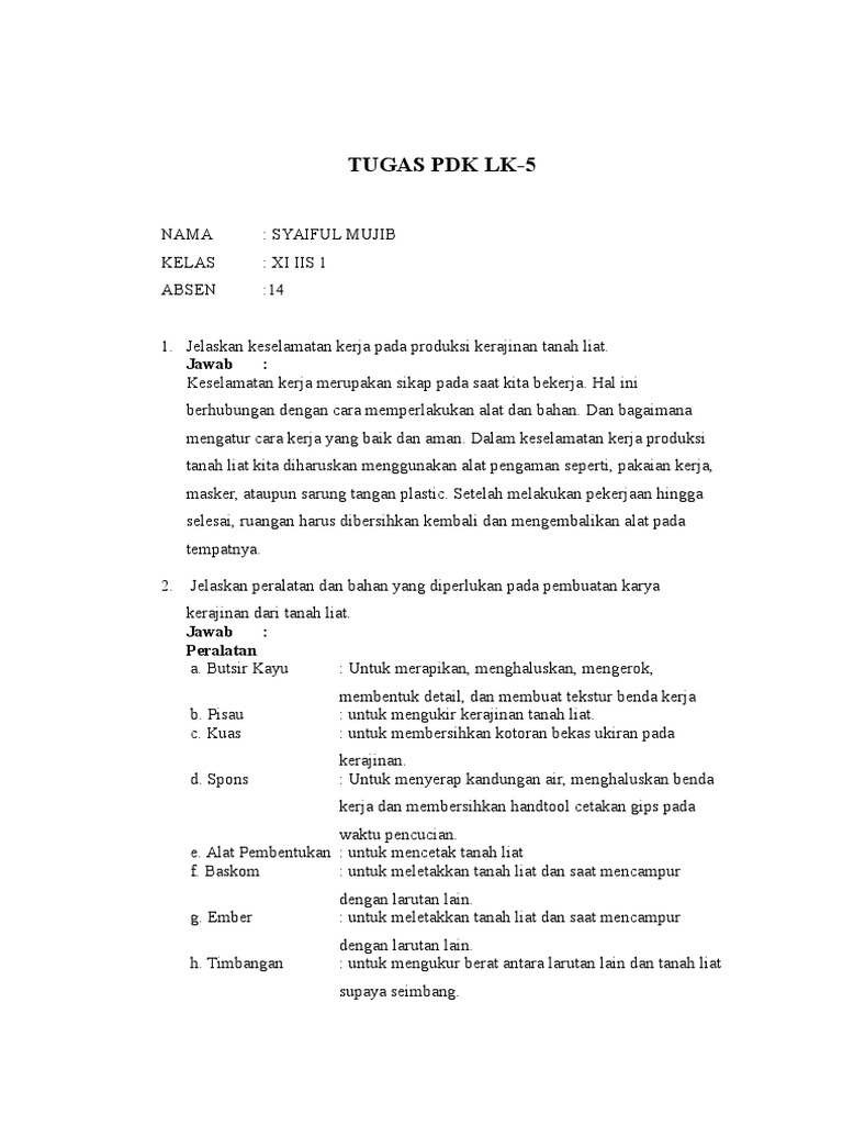 sebutkan alat alat pendukung yang digunakan untuk produksi kerajinan tanah liat, Pada pembuatan karya kerajinan tanah liat dengan teknik cetak tuang Bahan yang digunakan adalah, Teknik pembuatan tanah liat, Sebelum membuat prakarya dari tanah liat setiap siswa harus menyiapkan, Jelaskan langkah kerja pembuatan keramik dari tanah liat, Finishing tanah liat, Proses pembuatan kerajinan bahan lunak dari tanah liat, Teknik pengerjaan tanah liat, Tahap pembuatan gerabah dari tanah liat, Cara pembuatan kerajinan keramik, Tahapan membuat kerajinan tanah liat, Membentuk tanah liat menggunakan,
